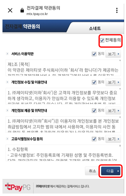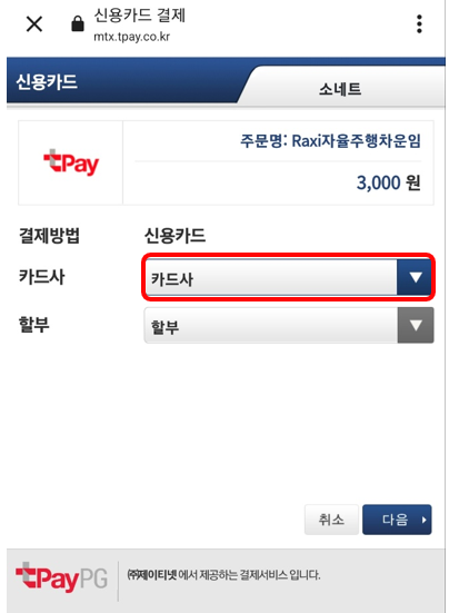 ⑥ 전자결제 진행을 위해 약관 동의, 카드사 선택 후 안내에 따라 진행해 주세요.