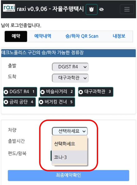 ④ 정류장, 차량, 시간을 확인하신 후 최종예약확인 버튼을 누르시면 예약이 진행됩니다.