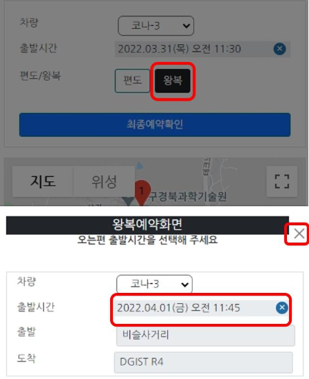 ④ 정류장, 차량, 시간을 확인하신 후 최종예약확인 버튼을 누르시면 예약이 진행됩니다.